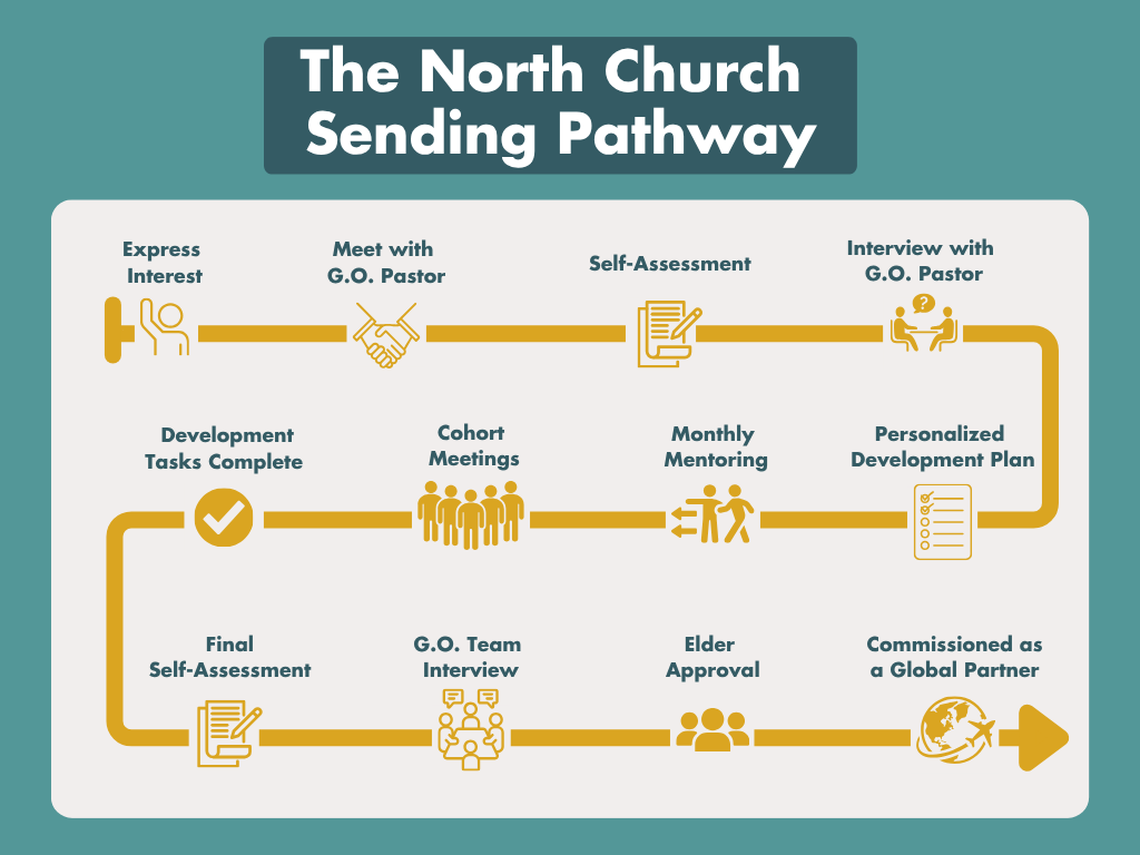 For those interested in serving as long-term vocational gospel workers to the nations, The North Church's Sending Pathway exists to help the church, assess, develop, affirm, and send out members who are interested in pursuing this path. For more information, or to express your interest in being considered for The Sending Pathway, please fill out a Missions Interest Form.